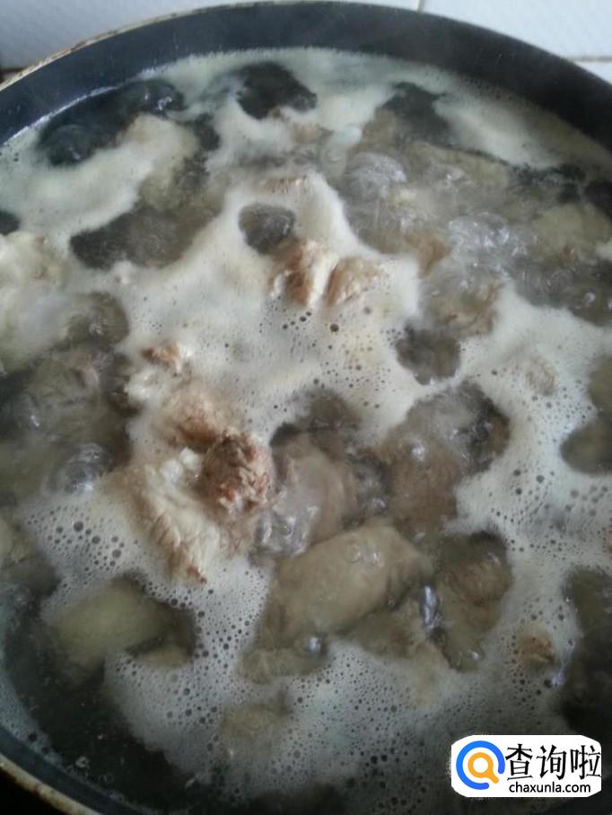 锅中添水,排骨洗干净凉水下锅焯水捞出,排骨焯水的同时,将姜和大蒜洗净切片,香葱洗净切末