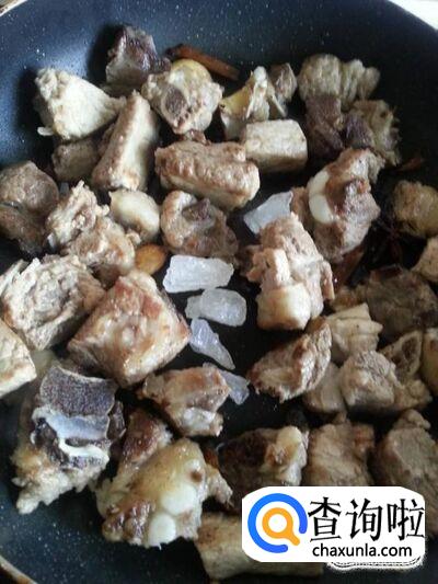 排骨下入锅中翻炒,炒至表面微黄,然后加入冰糖,小火翻炒