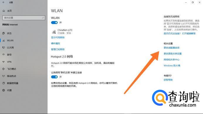 进入“WLAN”设置菜单页面后,接着点击右方的“更改适配器选项”字样。