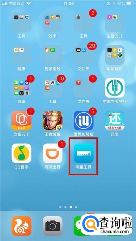 首先在我们的手机桌面上找到测量工具并点击它,如下图所示。