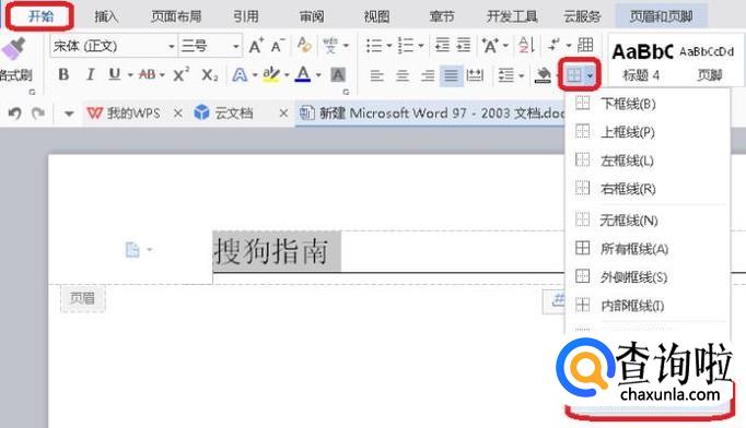 如果要对页眉中横线格式进行修改,选中页眉文字后,点击“开始”,然后点击“边框”,在下拉菜单中选择“边框和底纹”。