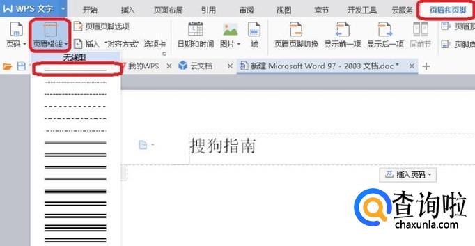 如图所示,点击“页眉和页脚”,在下方工具栏选择“页眉横线”,软件默认是“无线型”,我们选择一种横线格式就行。