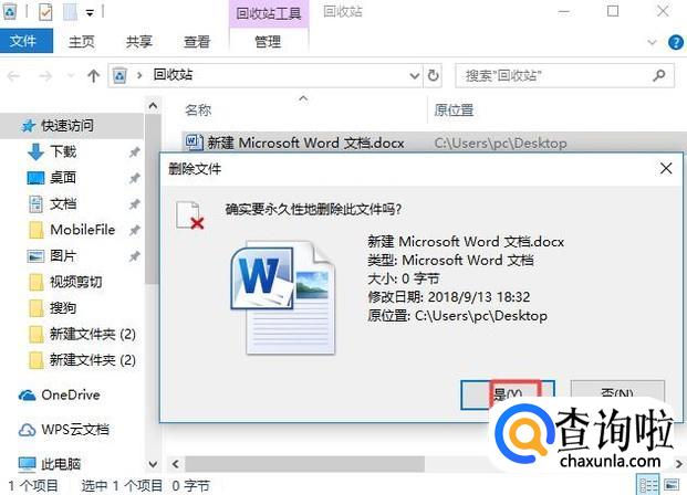 弹出的界面,我们点击是就可以了。这样我们就彻底删除了该文件了。