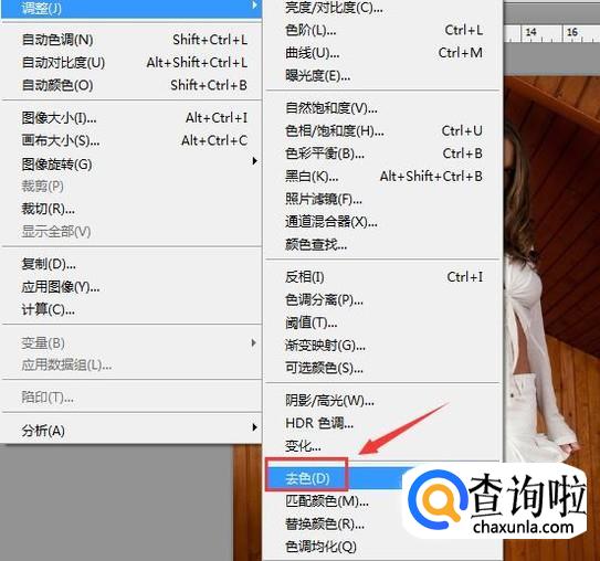 点击调整选项在其子级菜单哪里去色选项,如图所示: