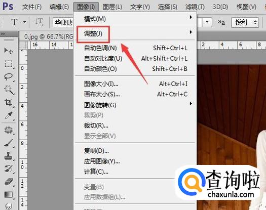 使用ps打开我们的需要的图片素材,然后再在图像菜单哪里找到调整选项,如图所示: