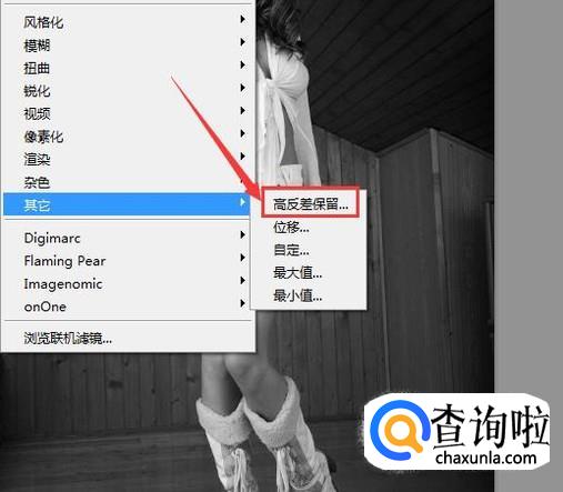 点击去色选项再在滤镜菜单里其他选项,点击该选项在其子级菜单哪里找到高反差保留选项,如图所示:
