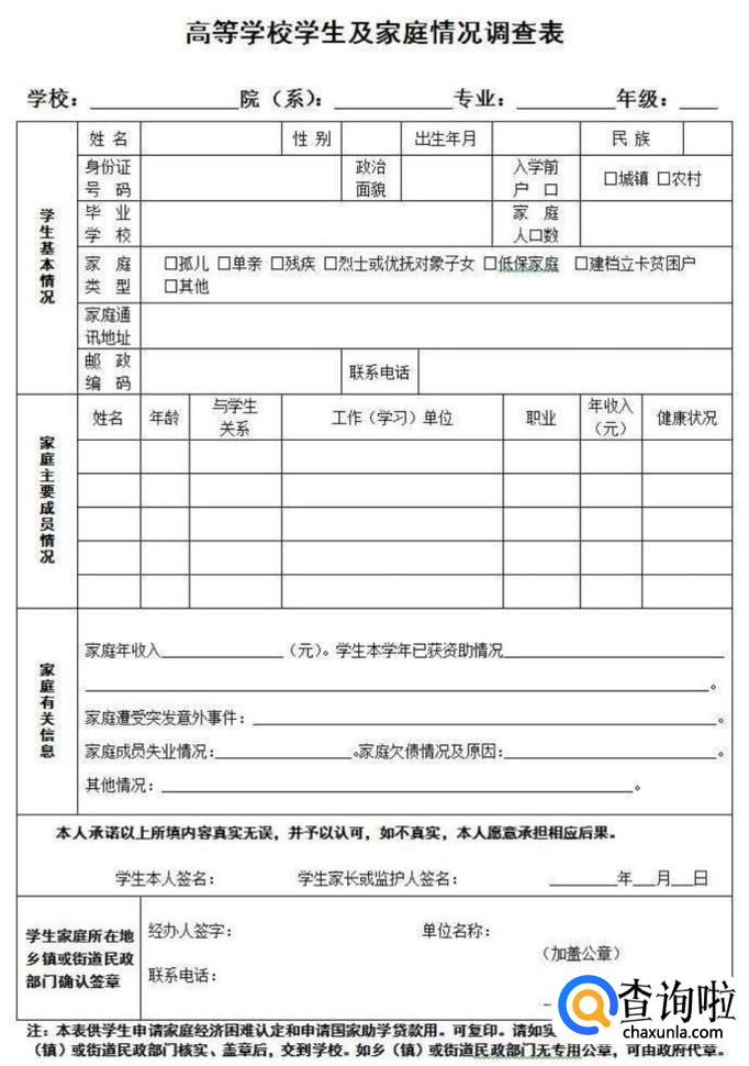填写家庭情况调查表基本信息。一般会在新生的录取通知书里面附有一个此类小册子,找出表,打印,如实填写,最好一式两份。