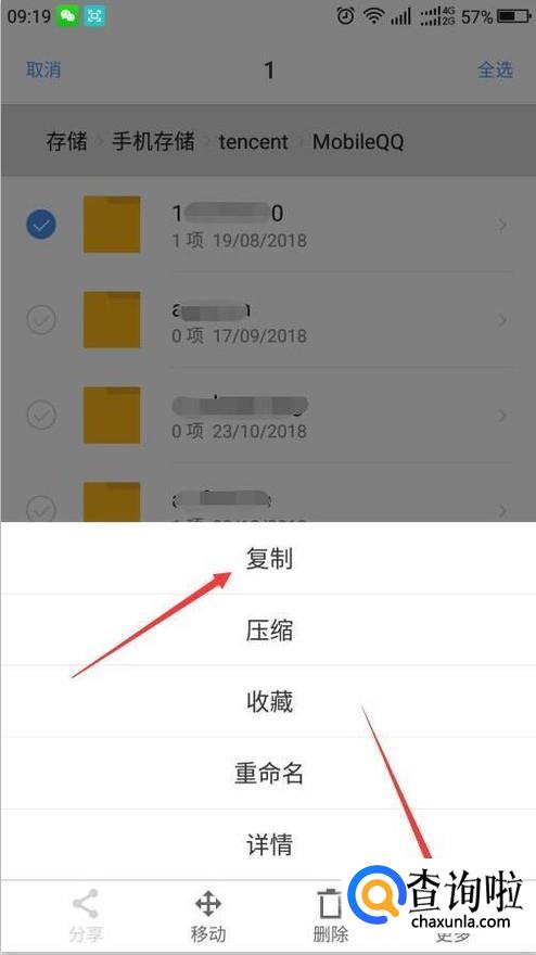 然后长按该文件夹,直到左侧出现蓝色打勾,再点击右下角的更多,点击出现的复制。