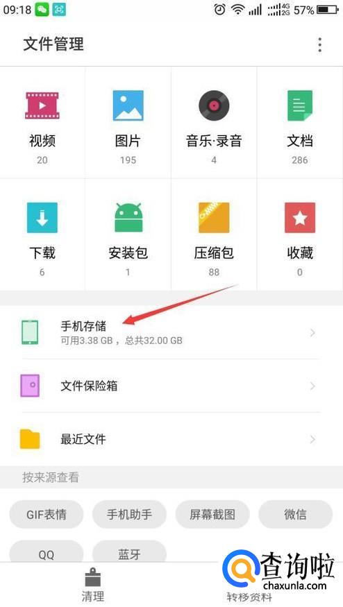 进入文件管理界面,找到手机存储,或叫存储,各手机不同。点击进入。