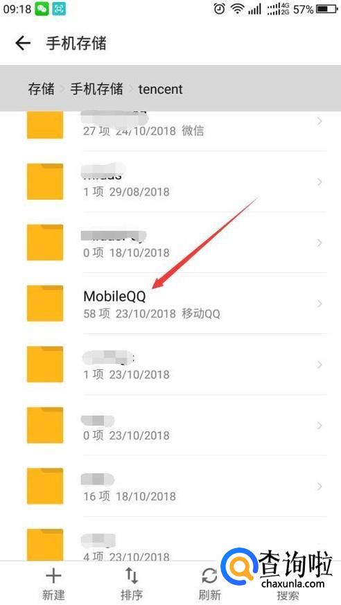 进入后继续滑动屏幕,找到MobileQQ文件夹,这个就是手机QQ所在文件夹。
