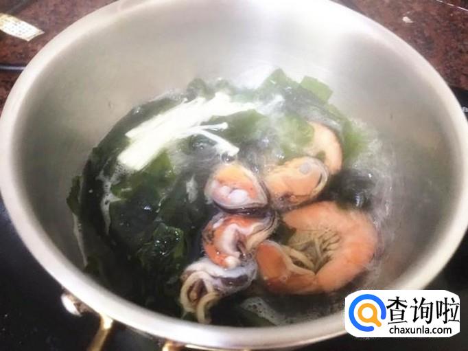 锅中倒入适量的水煮开之后,放入裙带菜煮