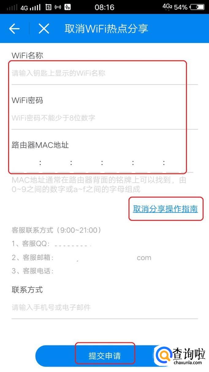 填写wifi名称等信息,点击“提交申请”就可以了。如果有疑问,还可以点击图中“取消分享操作指南”,查看说明。