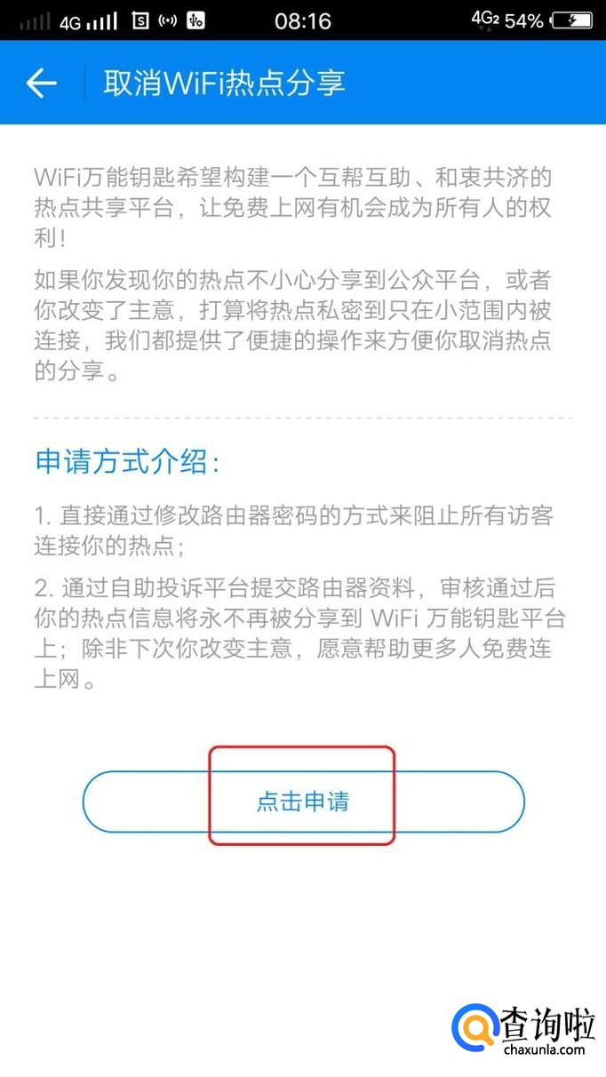 上面介绍了取消wifi热点分享的申请方式,我们点击申请。