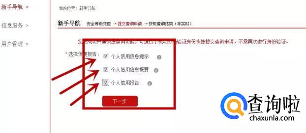 然后出现一个新的小框,将全部选择都打勾,点击系一部之后,在一个工作日内就会收到征信中心的短信验证。我们一定要在接下来的七个工作日内用再次验证码登录网站查询提取征信报告,不然逾期后又会重新验证了。