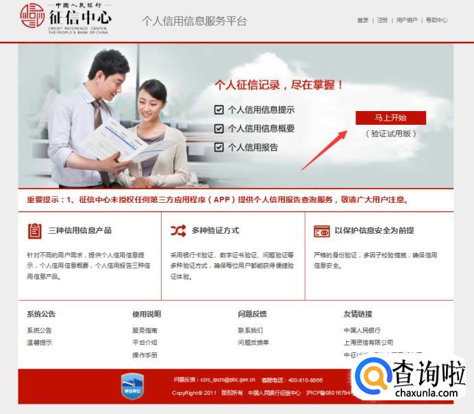 在点击【互联网个人信用信息服务平台】点击跳入登录界面,然后再点击屏幕上的【马上开始】,没有注册过的用户需要先注册账户。