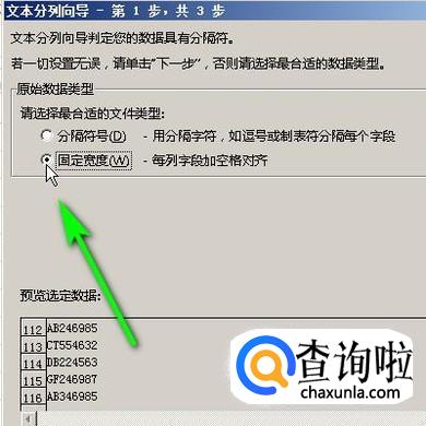 即时调出了分列导向面板,现在显示的是第一步操作面板。在这里点选:固定宽度;再点下一步。