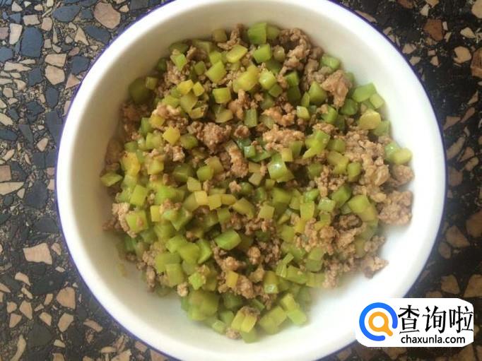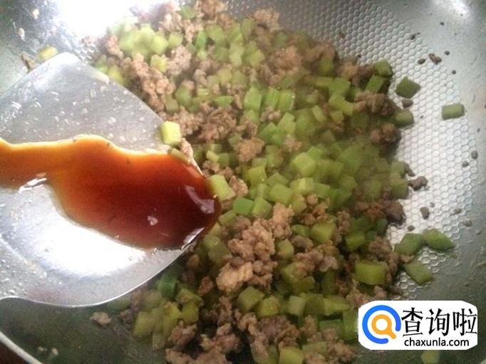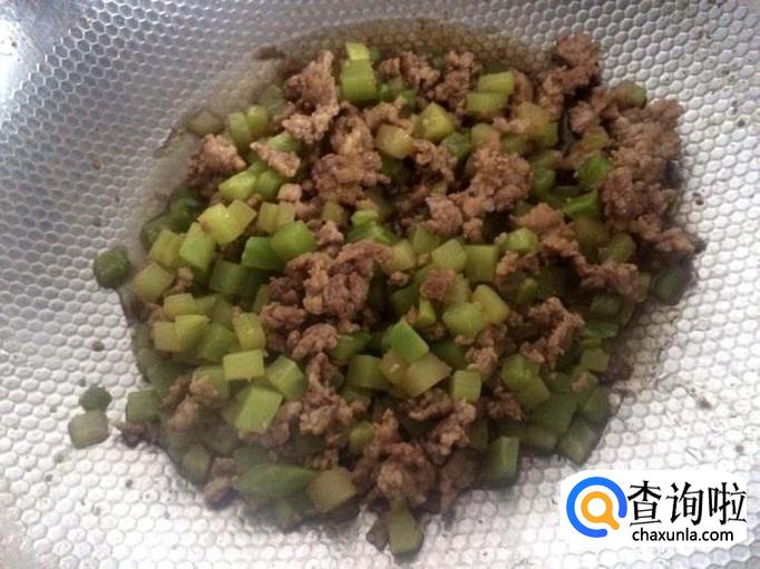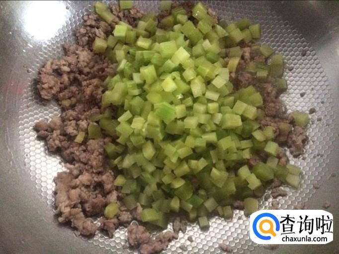 加莴笋丁与肉末一起翻炒。