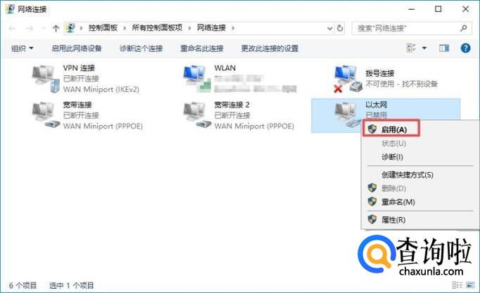 然后我们找到被禁用的网络,我们右击选择启用,启用成功之后,我们就可以联网了。