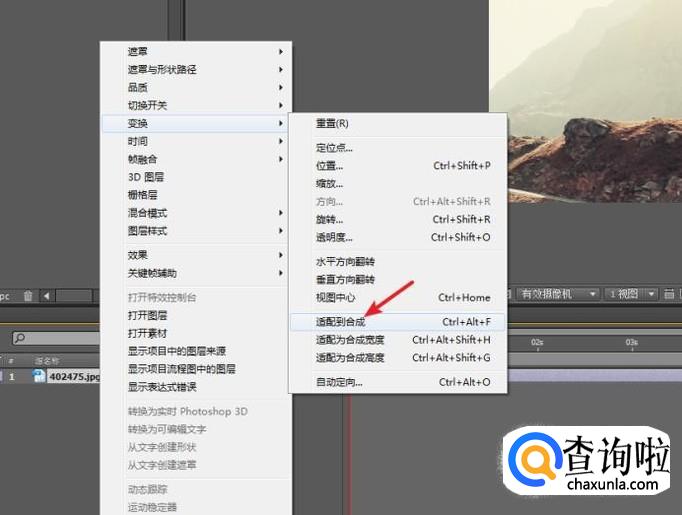 在图片图层上右击鼠标,选择“变换>适配到合成”,匹配图片与合成的大小。