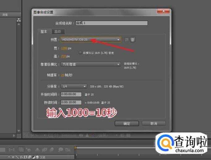 将预置设为:HDV/HDTV 720 (25),持续时间设为:10秒。
