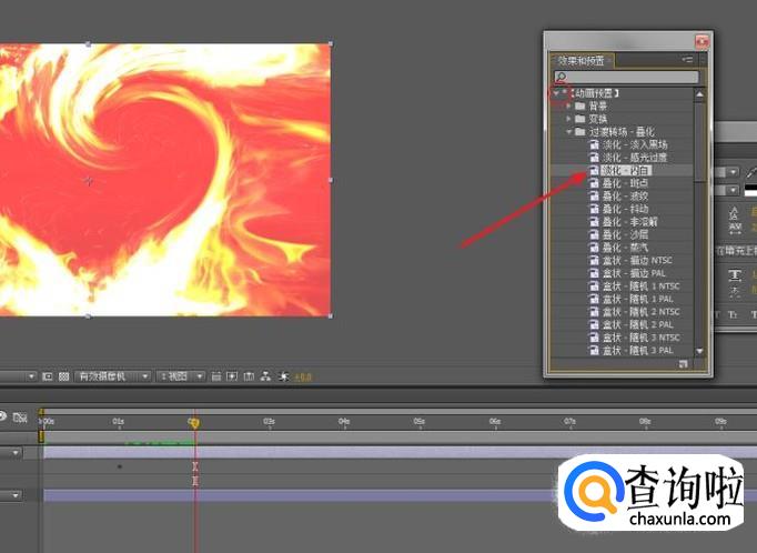 移动时间线指针到两秒,找到“效果与预置”(窗口>效果和预置),展开动画预置>过渡转场 - 叠化>“淡化 - 闪白”,为画面添加转场效果。