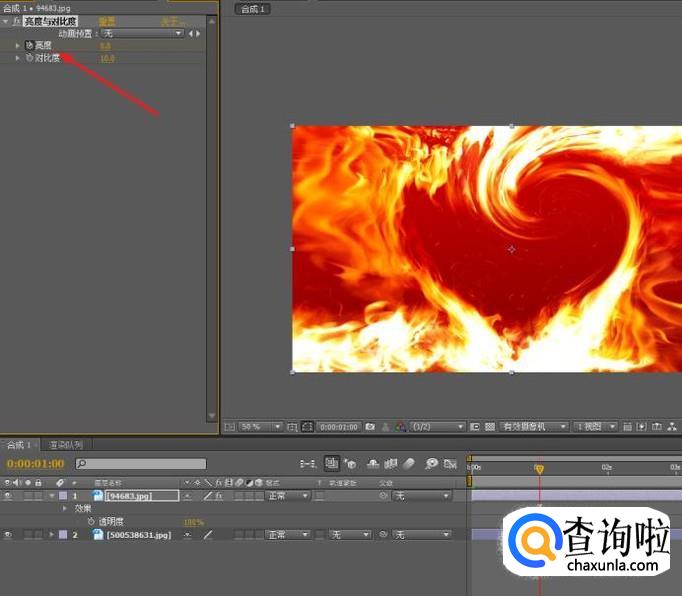 移动时间线指针到第一秒,为“亮度”属性添加关键帧。