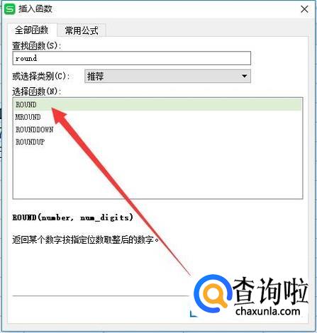 在弹出的函数选择项中,找到round函数,点击“确定”,如图所示。
