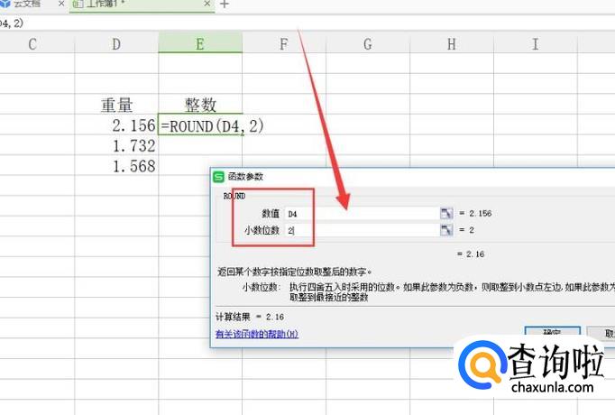 鼠标左键选择需要进行四舍五入的单元格,作为数值函数的参数,在小数位数里面输入想要保留的位数,如图所示。