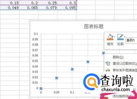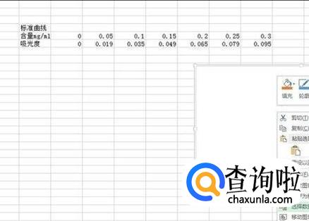 此时,图表区即出现一些坐标点,然后随意单击一个点,选择“添加趋势线”,选择“显示公示”、“显示R的平方值”,这样一条标准曲线即绘制完成。