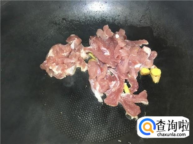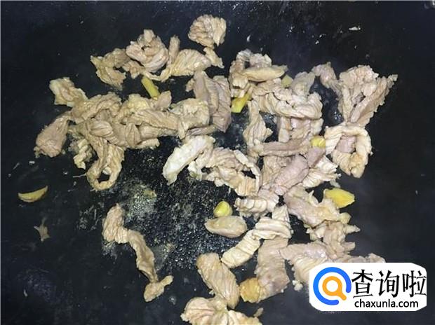 热锅下油,放入姜片煸出香味,然后倒入瘦肉,加入适量的酱油,翻炒瘦肉。