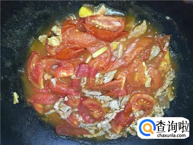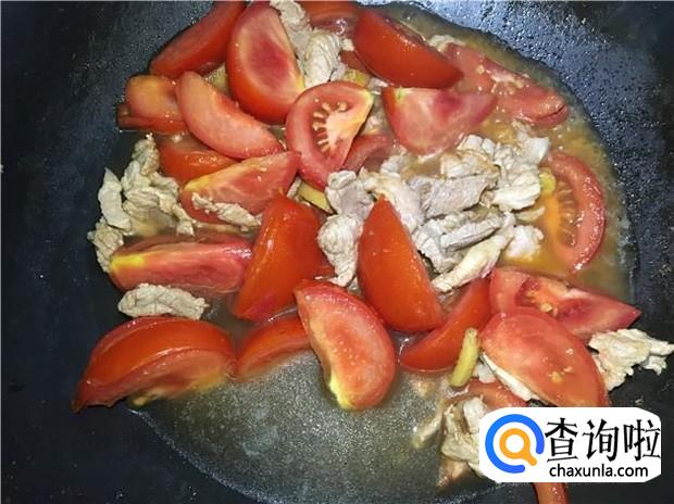 把瘦肉炒到变颜色后,即可加入西红柿,加入少许蚝油,翻炒均匀。
