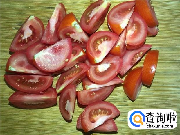 西红柿清洗干净,去掉蒂,然后切成小块。