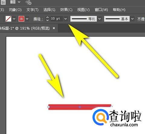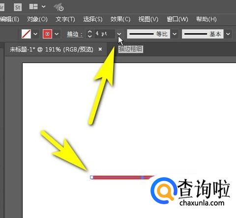 线条颜色修改后,假设,你想把线条的改粗些。那么,可以这样操作:选择线条,鼠标移到画板上面的属性栏这里,并点击描边粗细的下拉按钮。