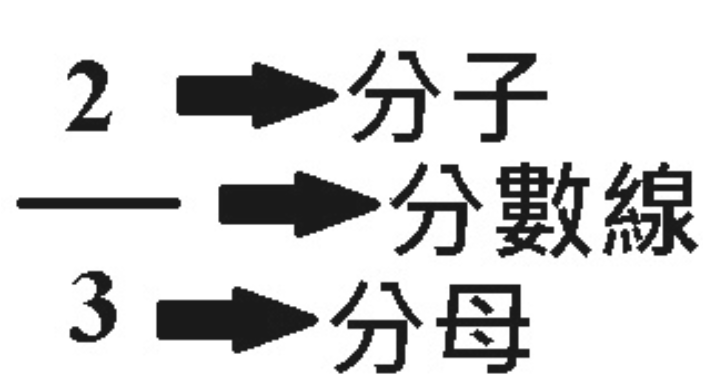 分数中间的一条横线叫做分数线,分数线上面的数叫做分子,分数线下面的数叫做分母。读作几分之几。分数可以表述成一个除法算式:如二分之一等于1除以2。其中,1 分子等于被除数,- 分数线等于除号,2 分母等于除数,而0.5分数值则等于商。分数还可以表述为一个比,例如;二分之一等于1:2,其中1分子等于前项,—分数线等于比号,2分母等于后项,而0.5分数值则等于比值。