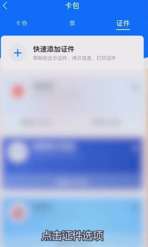 2、在卡包的界面中,找到证件按钮,点击证件选项,进入证件界面中。