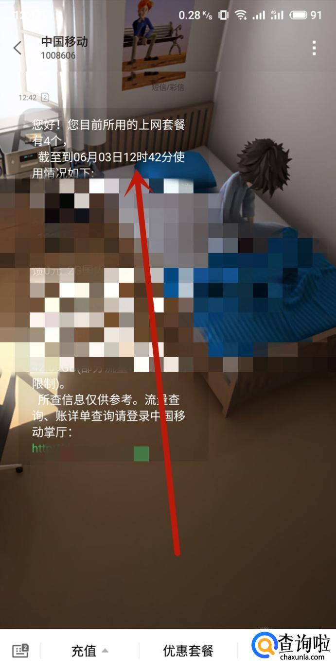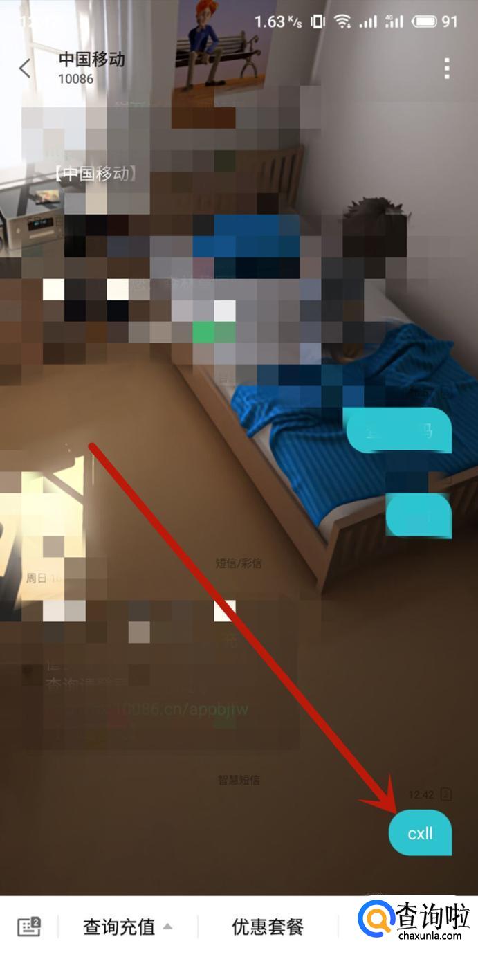 向中国移动发送短信“cxll”,如图所示。