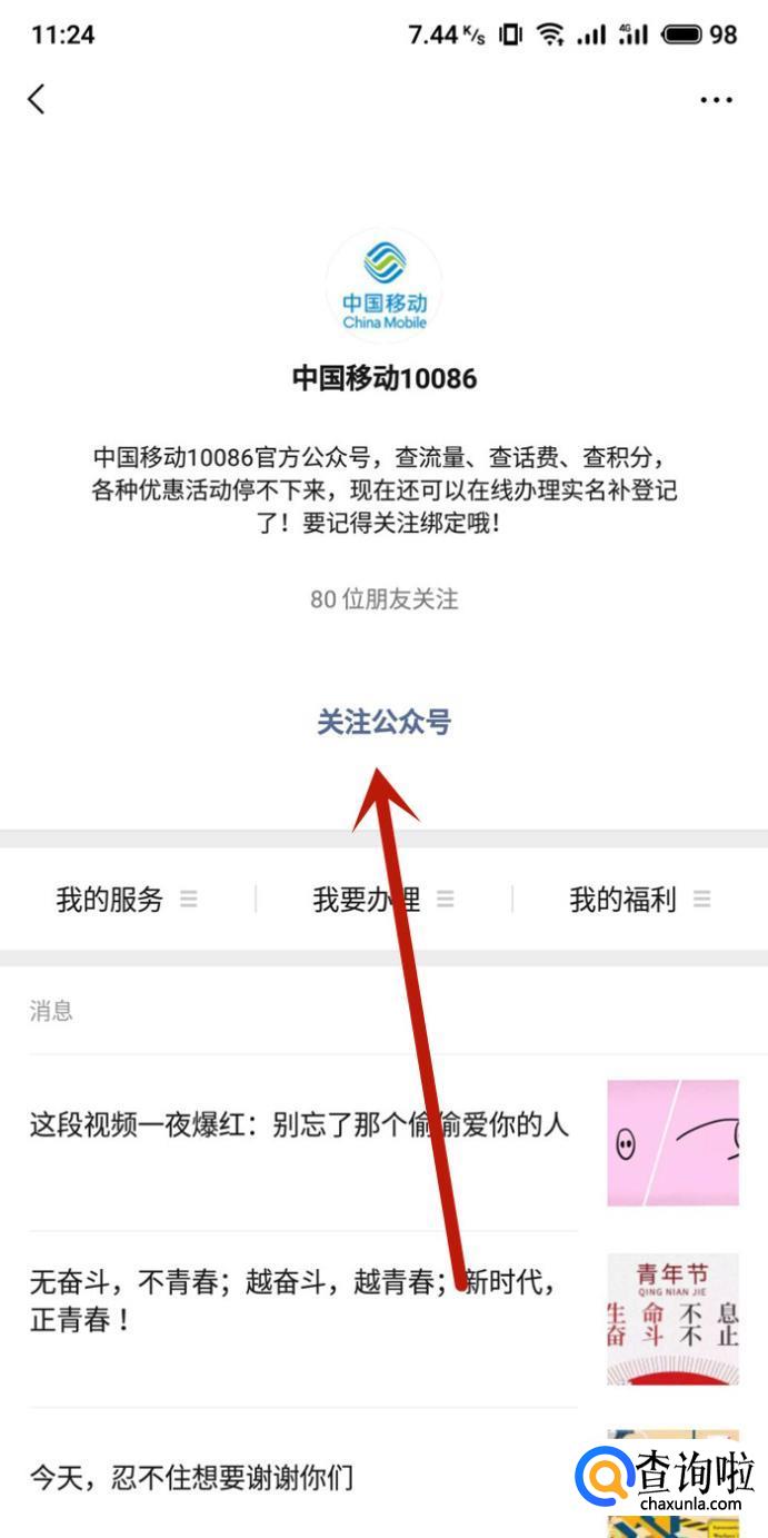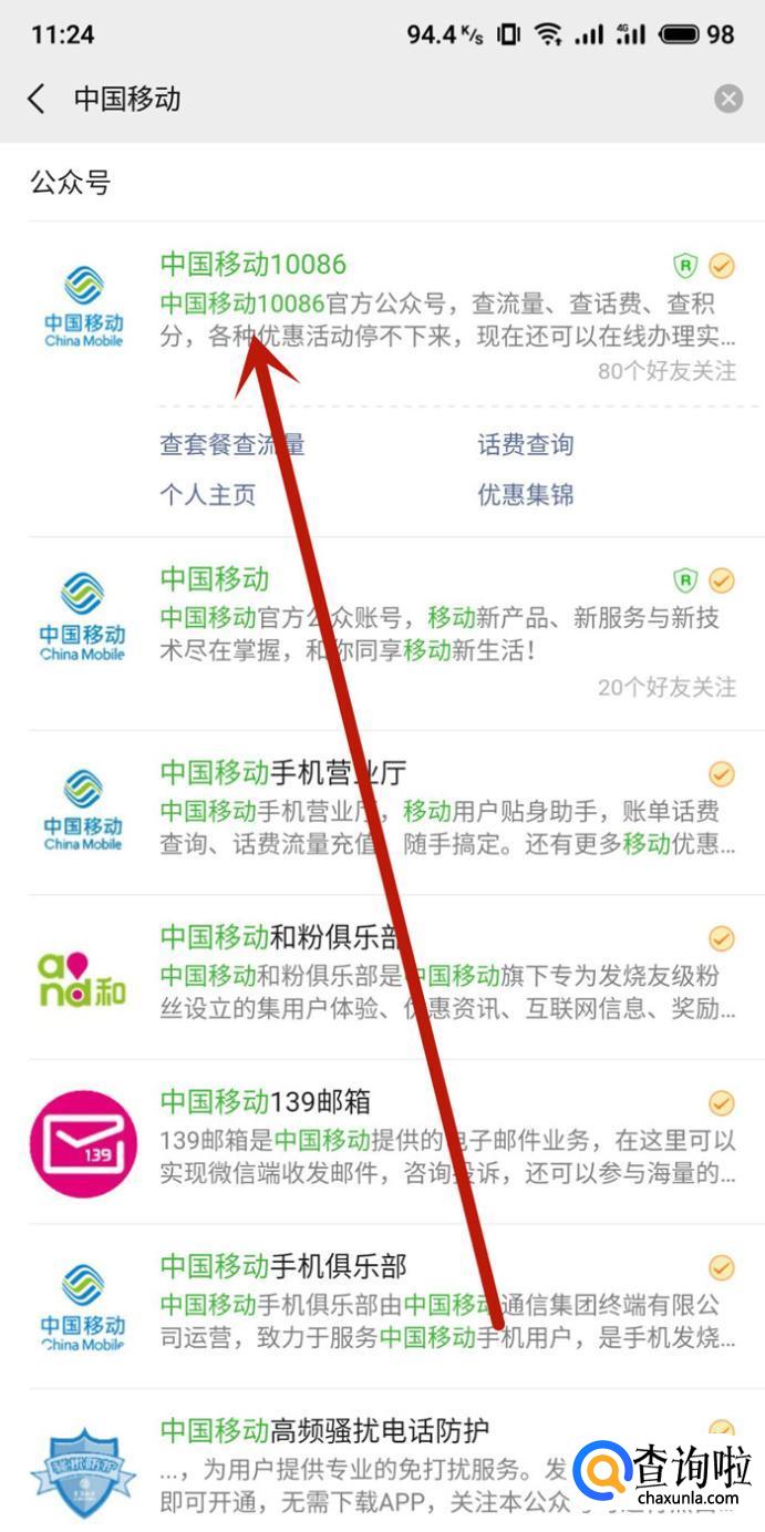 搜索中国移动公众号,点击并进入,如图所示。