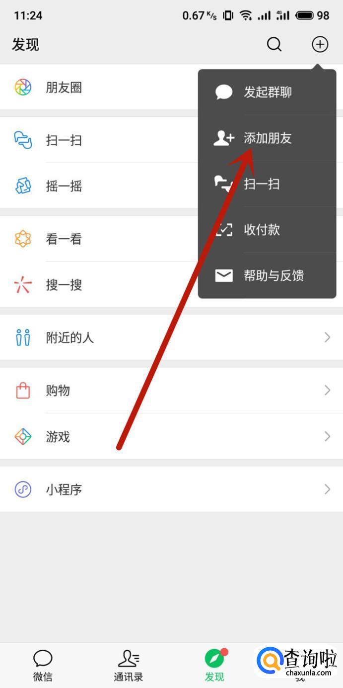 在微信发现页面,点击图示位置的“添加朋友”。