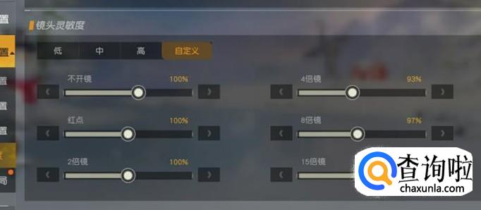 进入之后,找到镜头灵敏度,将不开镜设置为100%,4倍镜设置为93%,15倍镜设置为102%,如图所示。