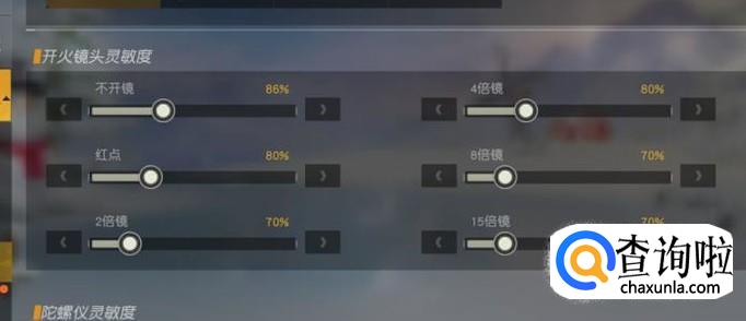 在开火镜头设置区域,将不开镜设置为86%,4倍镜设置为80%,2倍镜设置为70%,其他根据自己情况可自行调节。