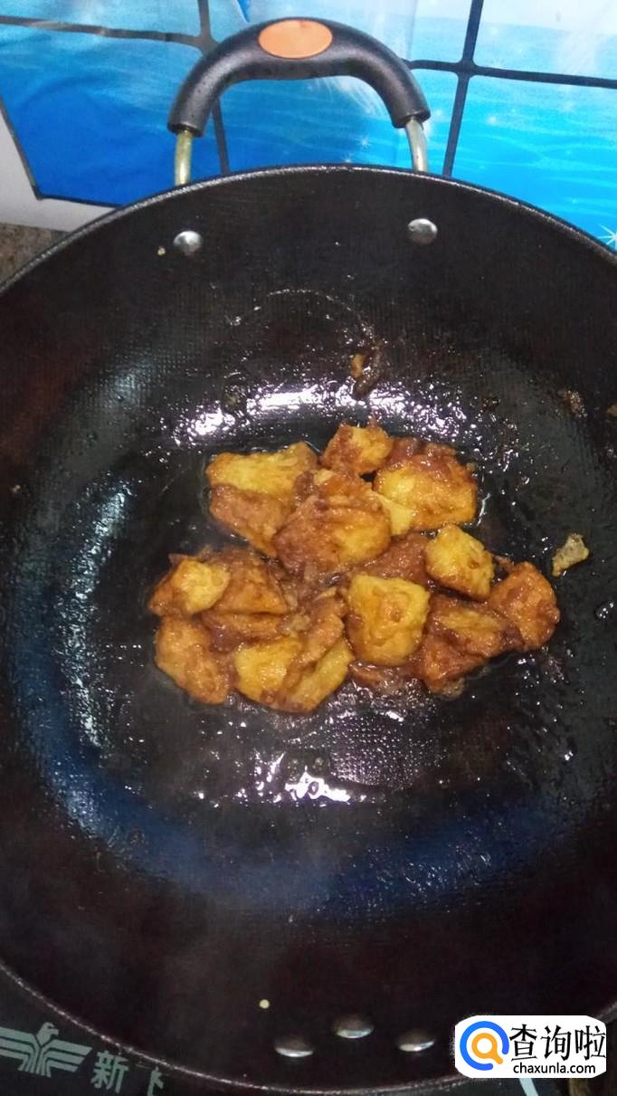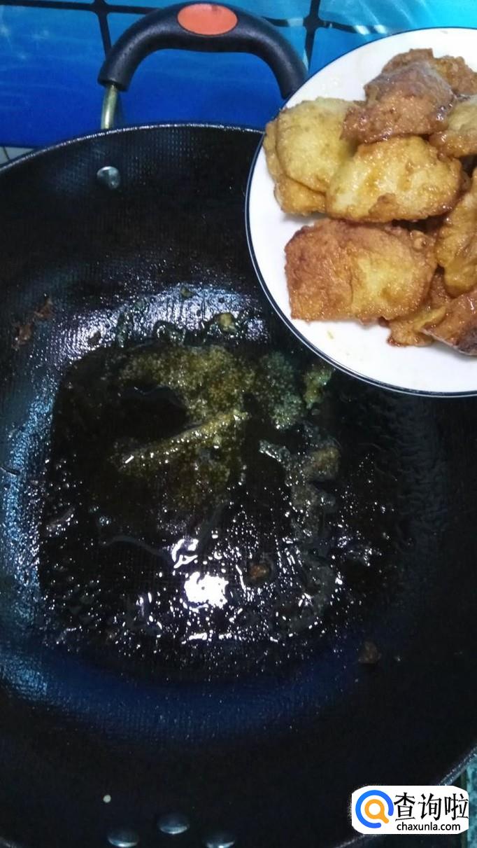 炒锅中放入适量白砂糖和清水,白砂糖和水的比例是2:1,小火慢慢熬,熬至大泡变成小泡,颜色发黄,开始变得粘稠,就将炸好的苹果倒入锅中,迅速翻拌均匀。