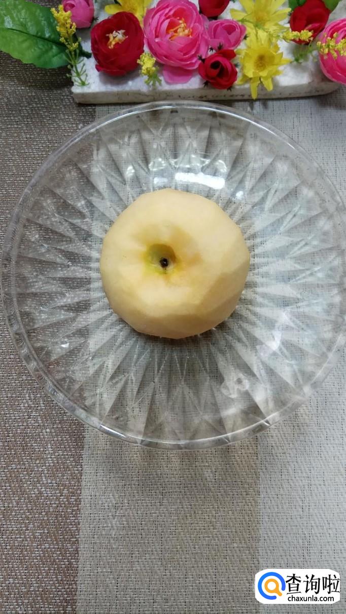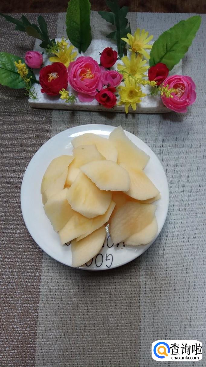准备一个苹果,削去外皮,切成滚刀块儿,放入盘中备用,这里选用的苹果是红富士苹果,味道香甜。