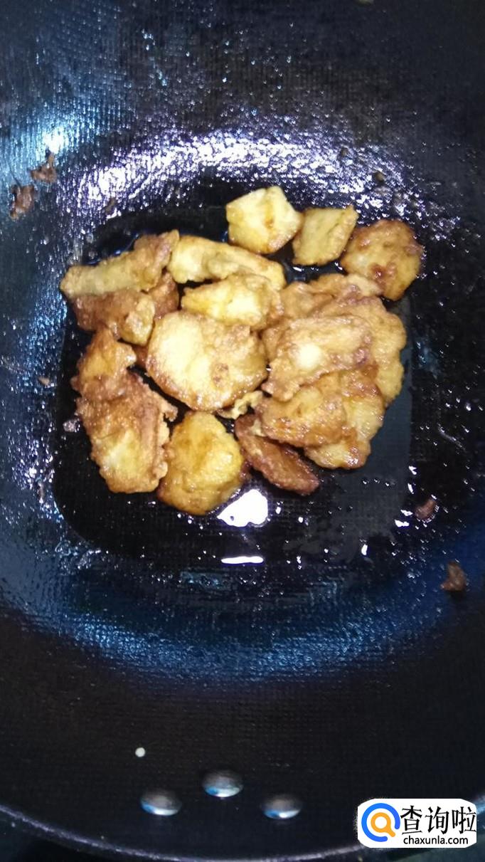 锅中烧油,油热后,将准备好的苹果放入锅中,小火慢炸,炸至金黄,出锅待用。