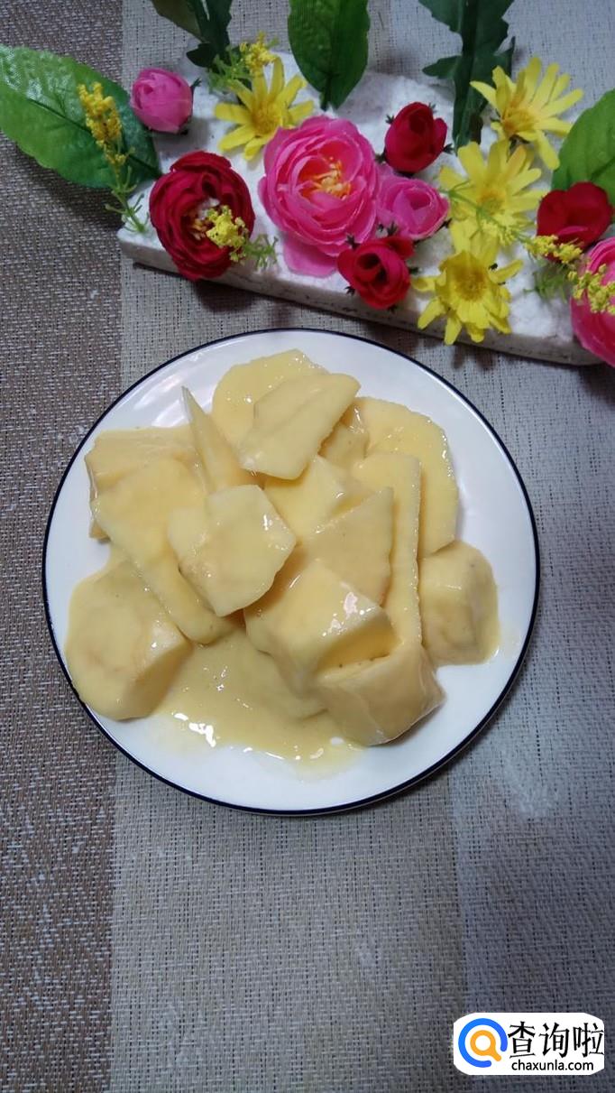 将切好的苹果放入面糊中,让其均匀的沾上一层面糊,放入盘中备用。