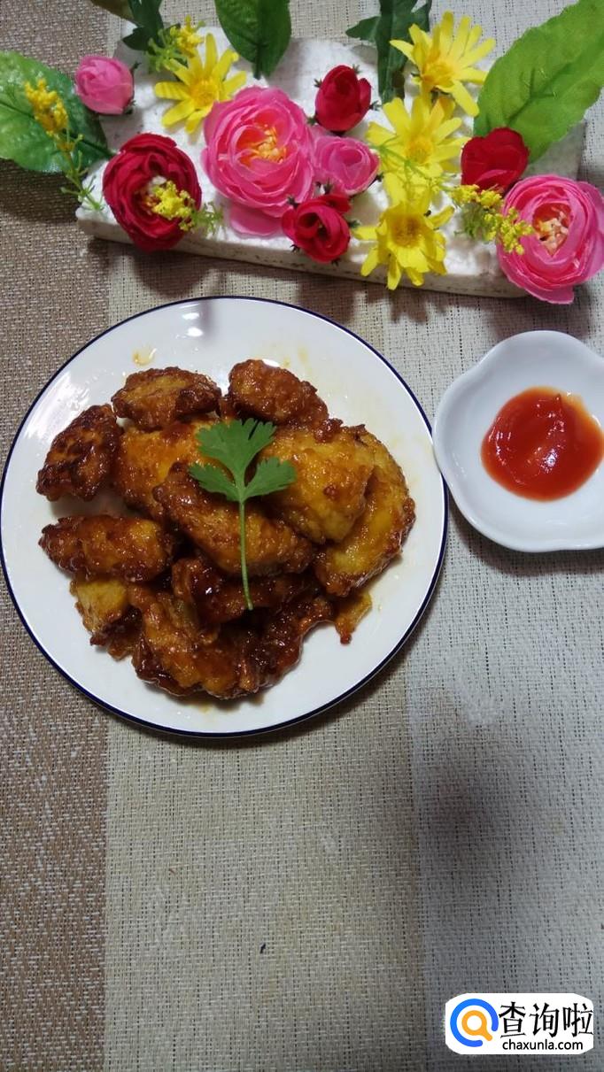 苹果一个,白砂糖适量,鸡蛋一个,淀粉适量,番茄酱适量,香菜适量。