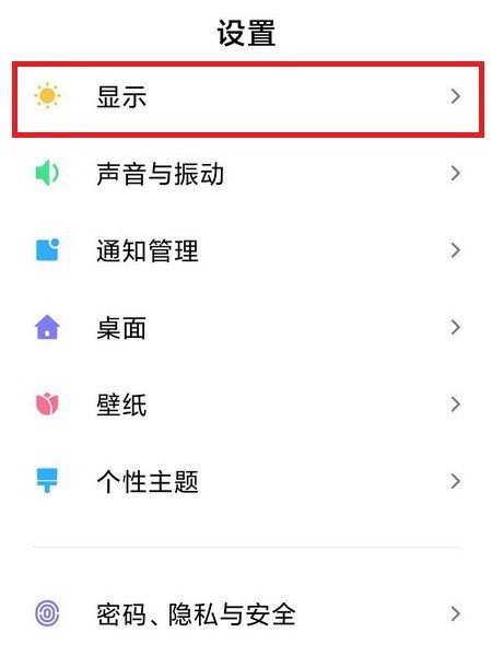 2、列表中找到“显示”选项,点击后方向右箭头。