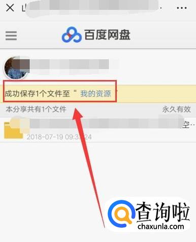 登录上自己的账号就会显示“成功保存一个文件至‘我的资源’”,这样就把文件保存到百度网盘里面了。