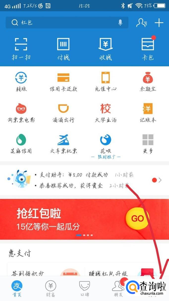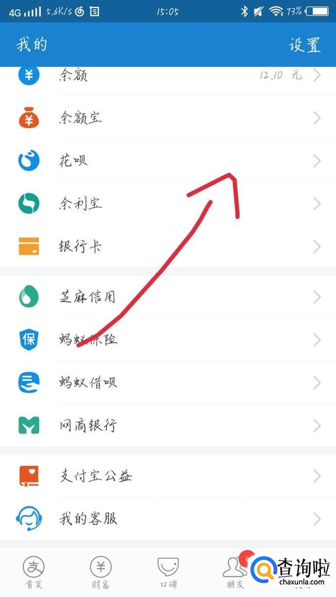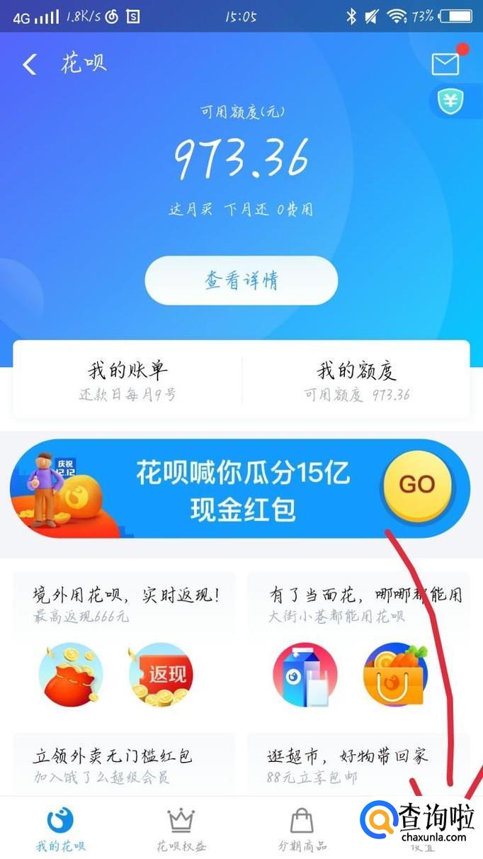 点击右下角的“我的”选项,如图1所示。你会看到进入一个新的界面,点击“花呗”选项,如图2箭头所示。