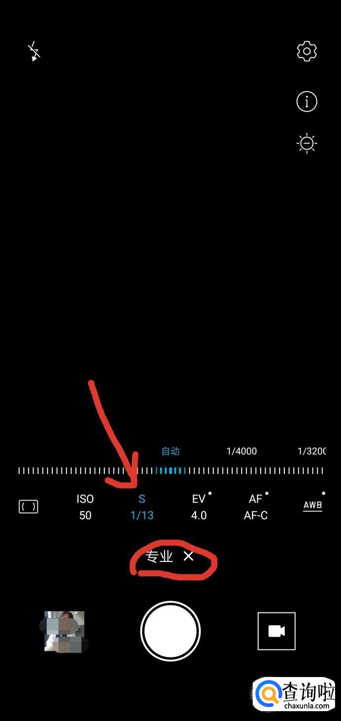 点按箭头指向的S标志,该参数是快门曝光时间。曝光时间结束之前需要保持设备静止,否则画面会模糊。将快门曝光时间设置为几秒钟,如果秒数过长用手持的姿势是没有办法保证手机稳定的,这样拍摄照片的画质会模糊。