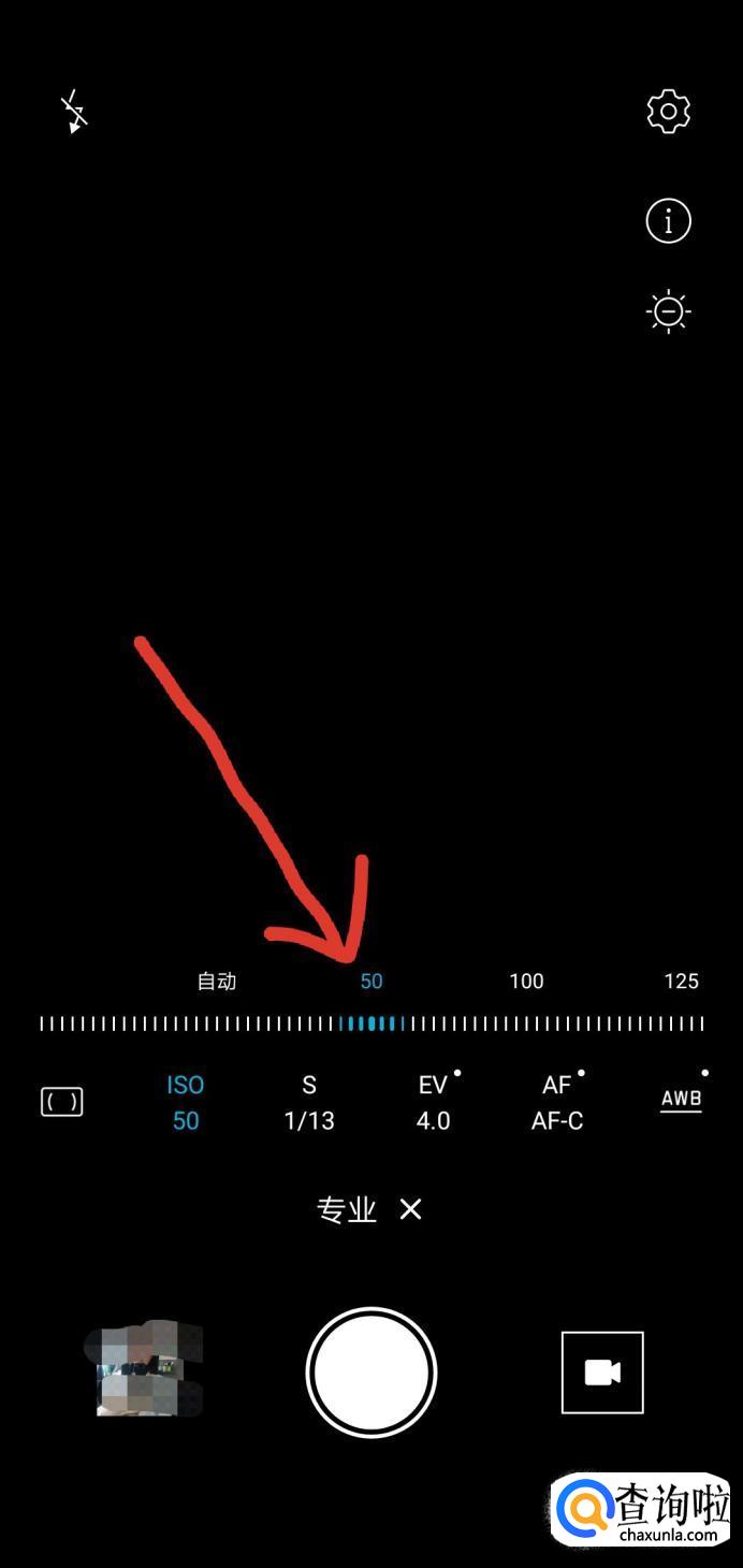 将ISO参数值条通过左右滑动屏幕调节到最低的50。